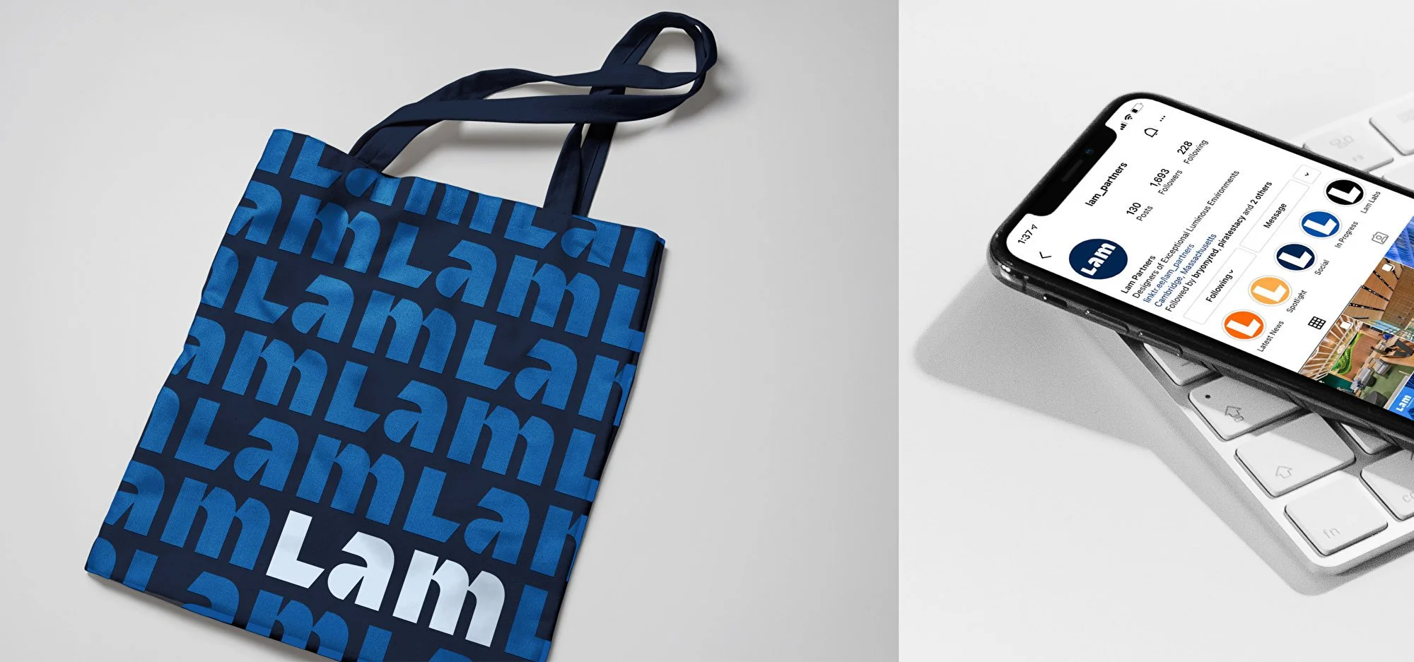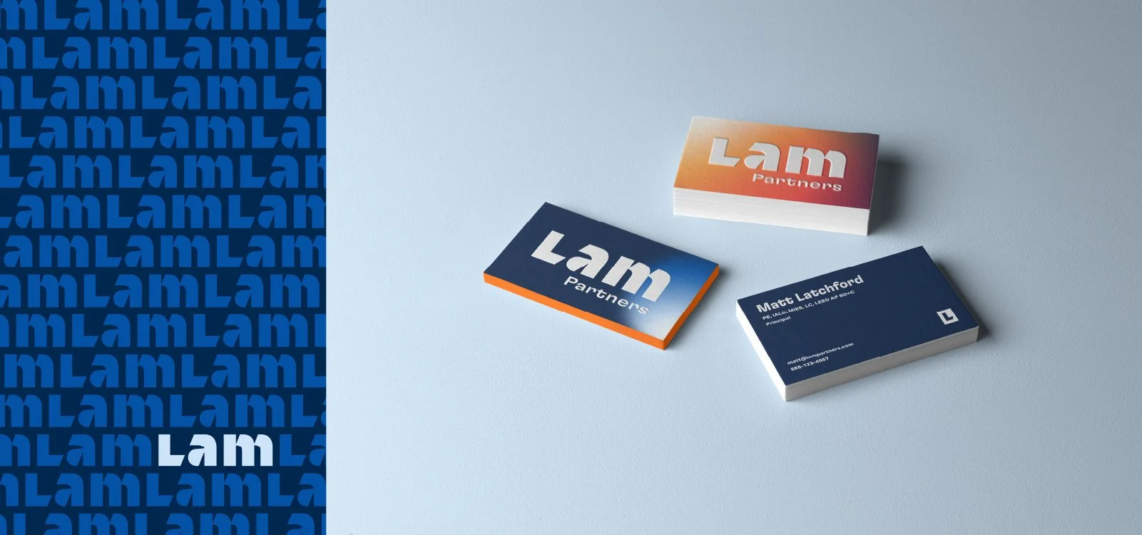 Lam’s logo letterforms began as a stencil font, inspired by a standard practice in architecture schools worldwide, and were then customized to illustrate that manner in which light transforms spaces. The ‘L’ represents a door casting a shadow, while the notched counter spaces in the ‘a’ and ‘m’ are reminiscent of an emanating beam of light.